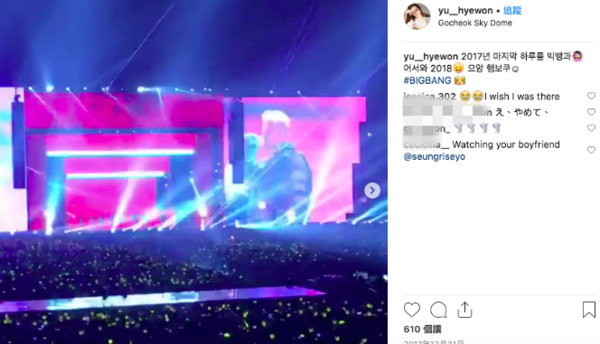 BIGBANG名望很高,尤其是胜利说得一口流利中文,受到许多忠实粉丝喜欢,迩来,却有海外粉丝挖出他的情史,几则贴文都直指他与一名名为유혜원(音译,惠媛)的女生有暧昧,女方外貌神似T-ara芝研、拥有出众的美貌,两人不只屡次在IG晒出摄影地址相似的照片,另有影片流出,胜利在YG上了一台车,女生随后也坐上同一台车。
